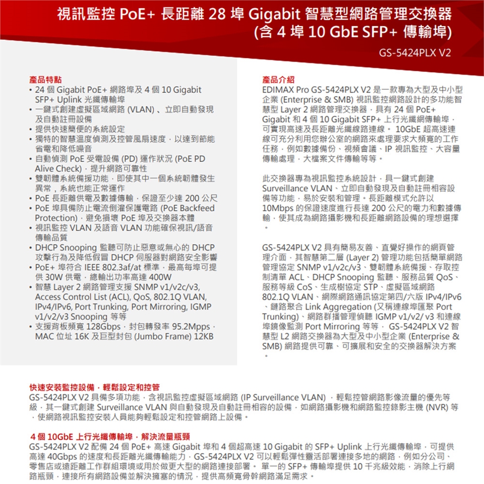 • 24 個 Gigabit PoE+ 網路埠及 4 個 10 Gigabit