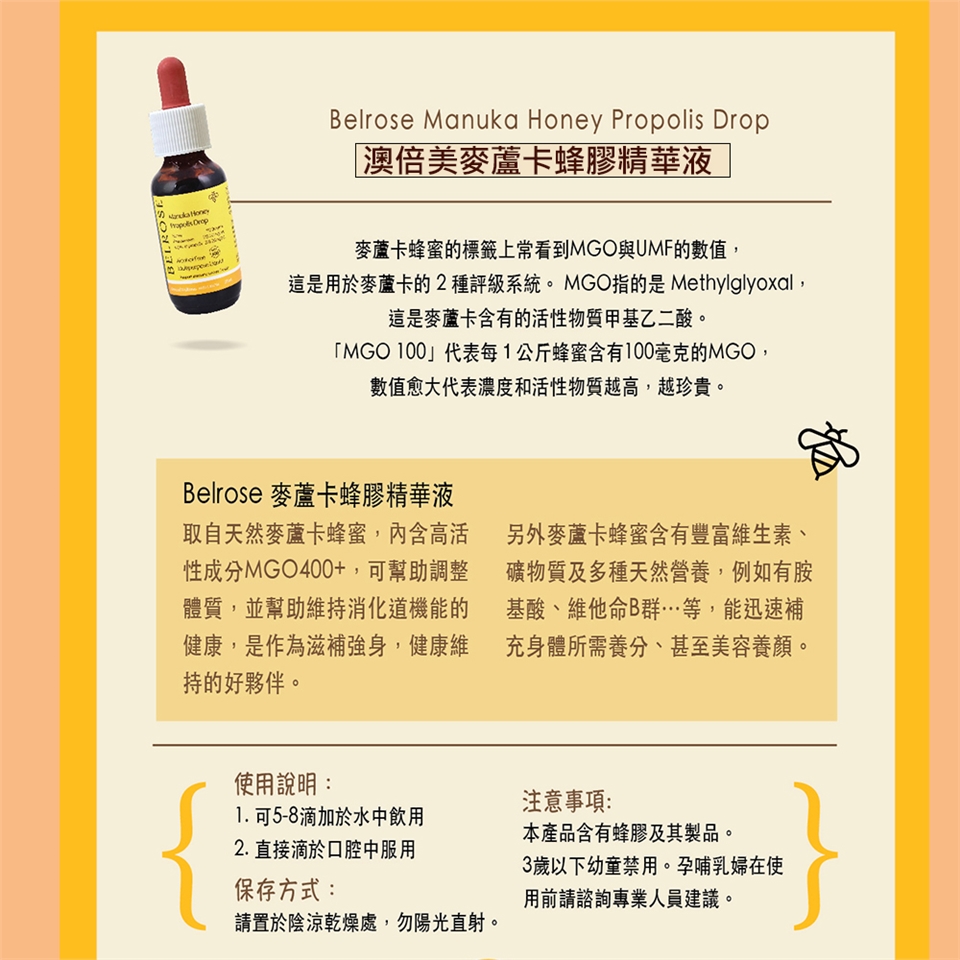 使 用 蜂 膠 精華液的好處跟方法,大家都知道,但是要純度高不含酒精又添加麥蘆卡蜂蜜MGO400+,卻是用這款Natures care製造的Belrose 的麥盧卡蜂膠精華液才有。