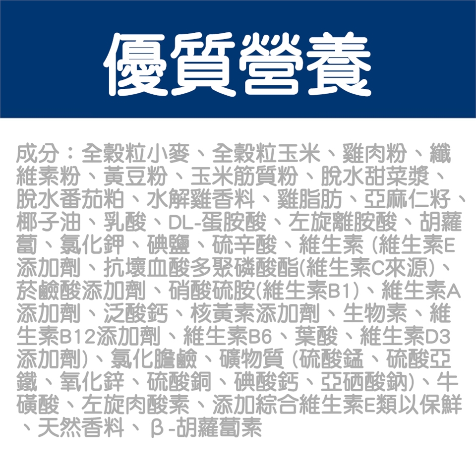 雞肉粉、全穀粒小麥、全穀粒玉米、黃豆粕、玉米筋質粉、黃豆粉、豌豆纖維、脫水甜菜漿、脫水番茄粕、雞肝香料、豬肉脂肪、亞麻仁籽、椰子油、豬肝香料、乳酸、纖維素粉、DL-蛋胺酸、左旋離胺酸、胡蘿蔔、碘鹽、維生素 (維生素E添加劑、抗壞血酸多聚磷酸酯(維生素C 來源)、菸鹼酸添加劑、維生素B1、泛酸鈣、維生素B6、維生素A添加劑、生物素、維生素B12添加劑、核黃素添加劑、葉酸、維生素D3添加劑)、硫辛酸、氯化鉀、氯化膽鹼、礦物質 (硫酸錳、硫酸亞鐵、氧化鋅、硫酸銅、碘酸鈣、亞硒酸鈉)、牛磺酸、添加綜合維生素E類以保鮮、左旋肉酸素、天然香料、β-胡蘿蔔素