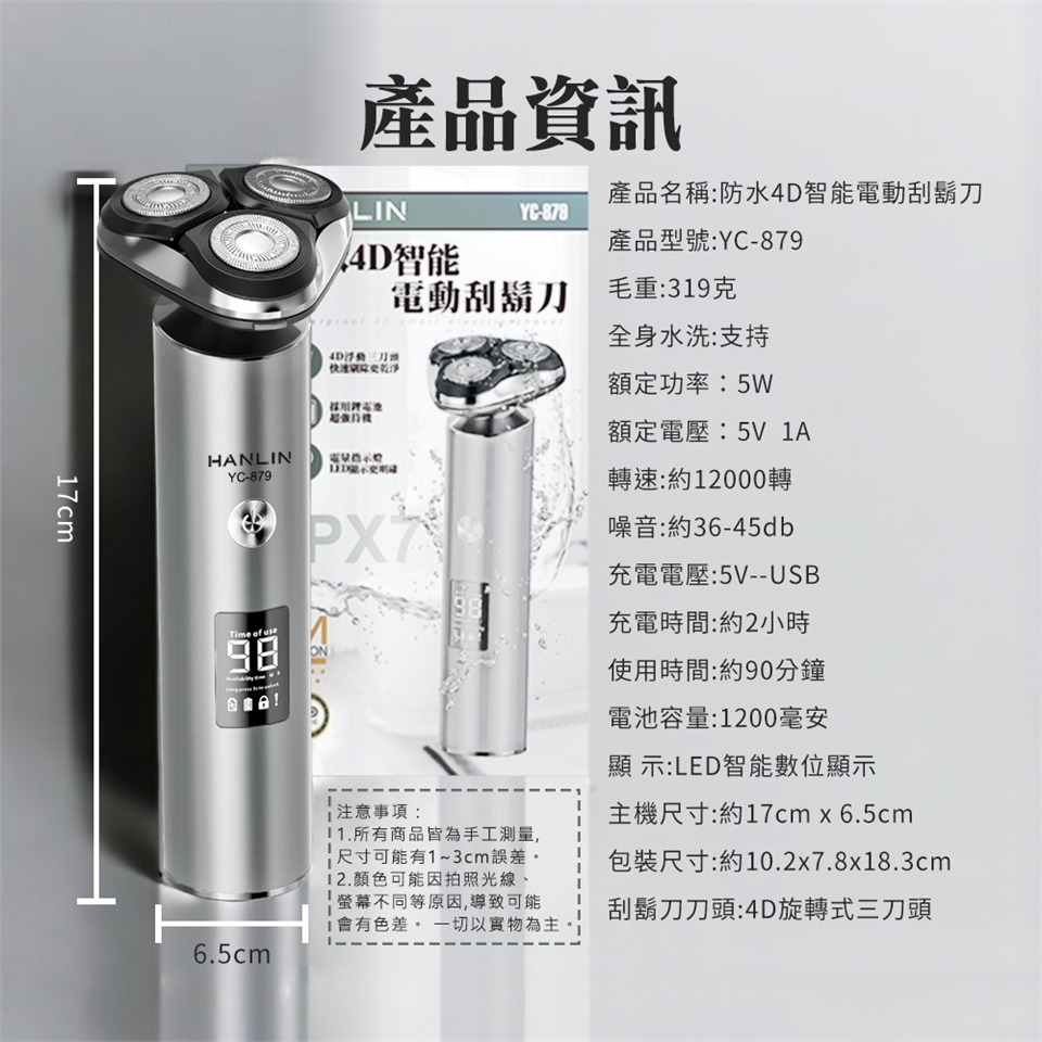 HANLIN- YC-879 防水4D智能電動刮鬍刀 全鋁 防水7級 IPX7 浮動刀頭 旅行商務 禮物 父親節