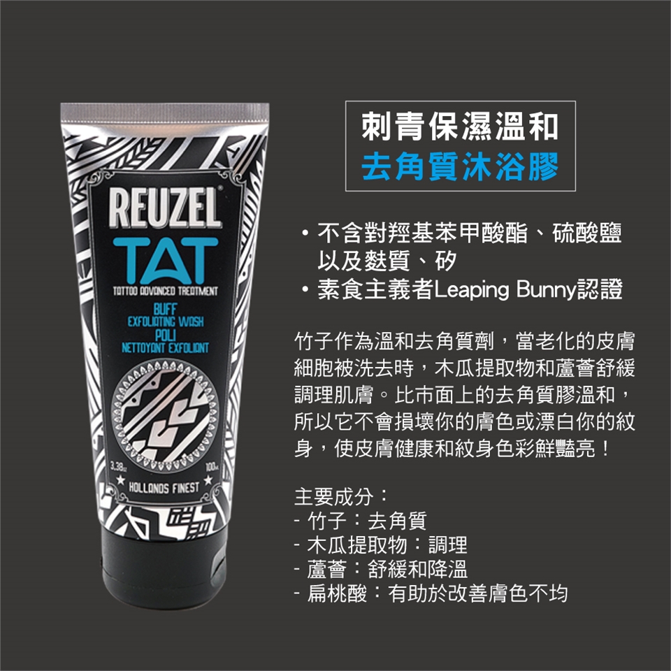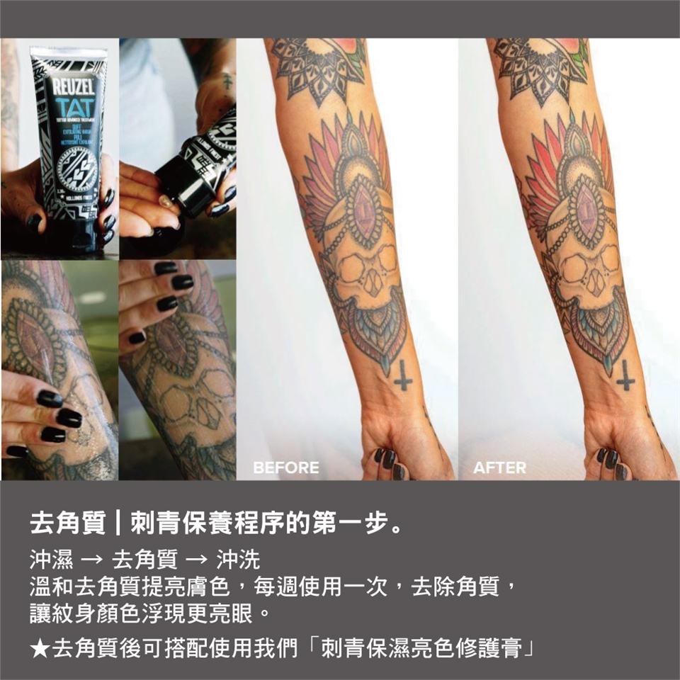●去角質沐浴膠:在紋身上沖濕→去角質→沖洗。