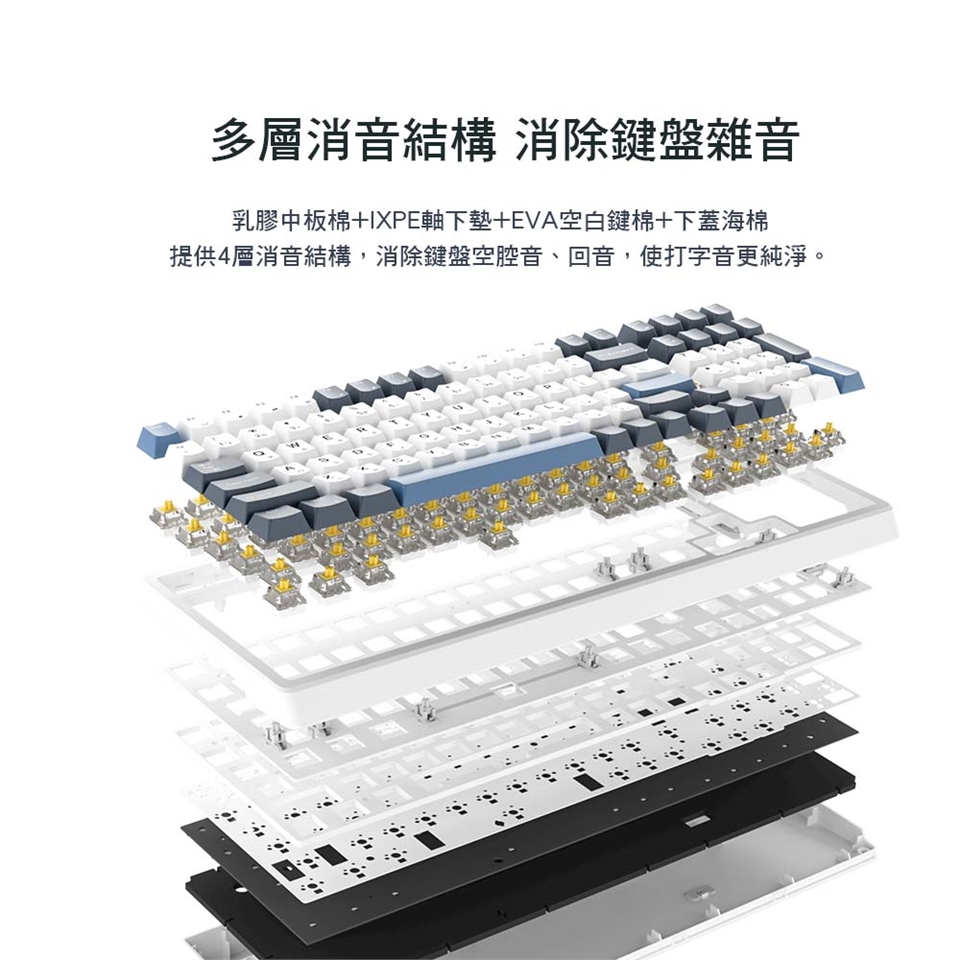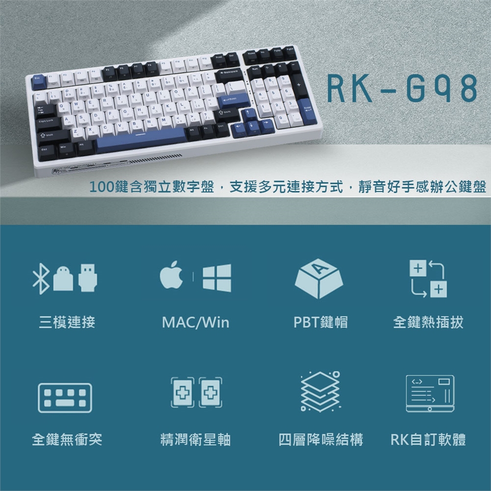 G98提供100鍵鍵位設計、獨立的數字盤,更利於辦公使用,且有四層隔音棉、好手感的K黃軸,讓使用者可享有安靜好手感的使用回饋感。