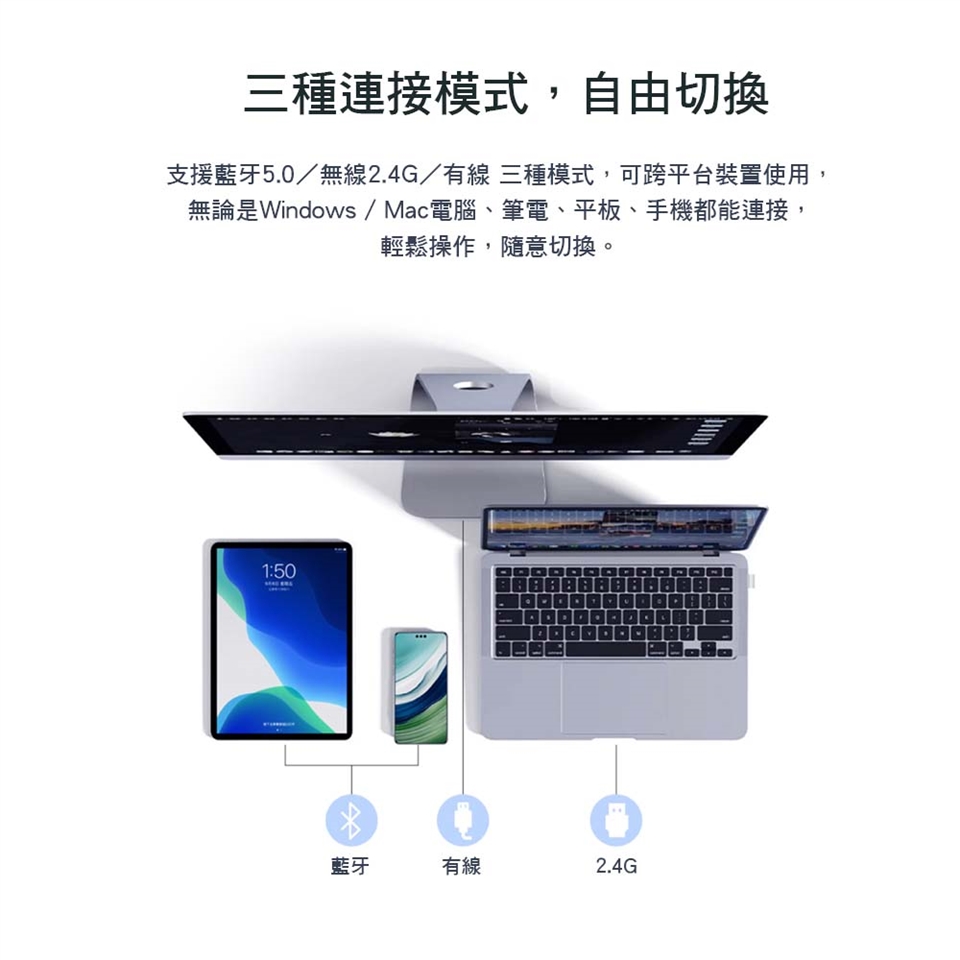 此鍵盤支援藍芽、2.4G無線、TYPE-C有線連接模式,可同步連接3台藍牙設備,並自由切換Windows / Mac 雙系統,滿足多元化的工作與跨平台操作需求。