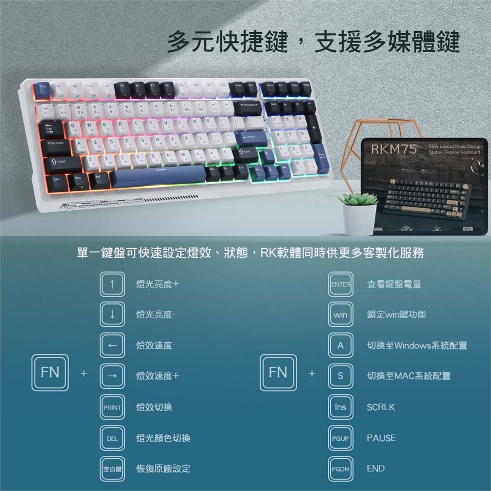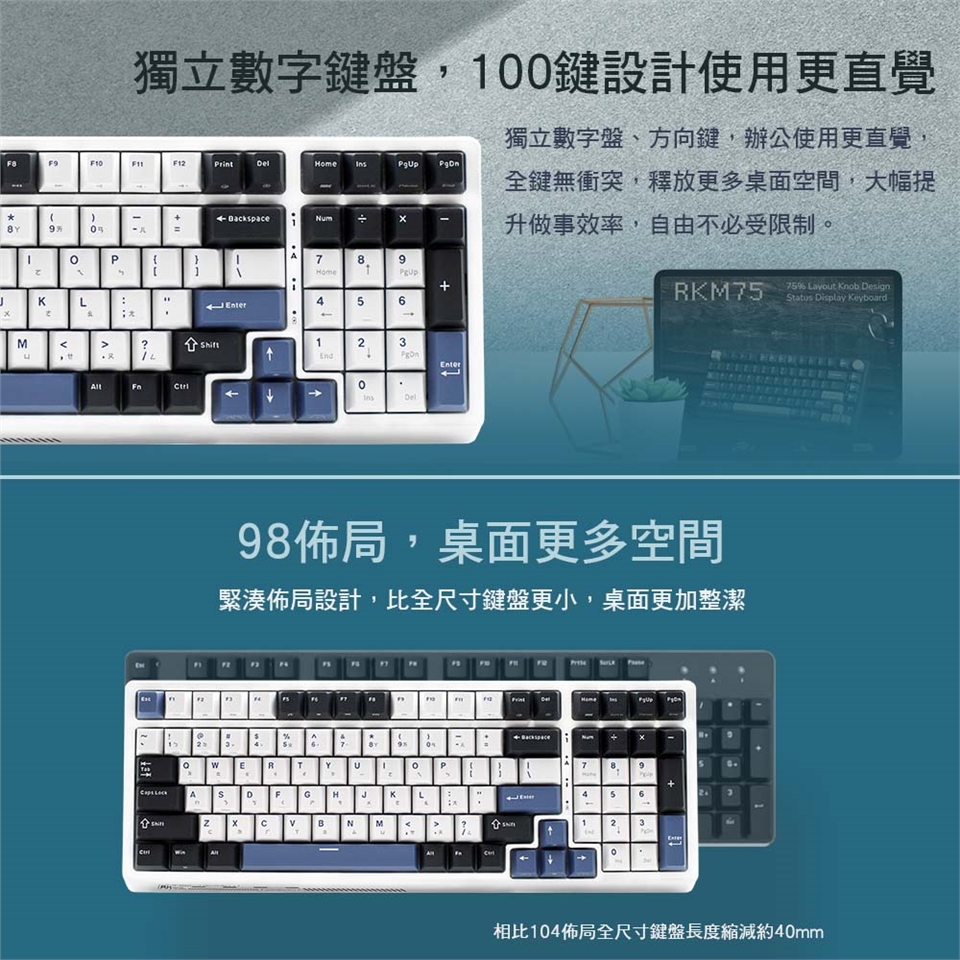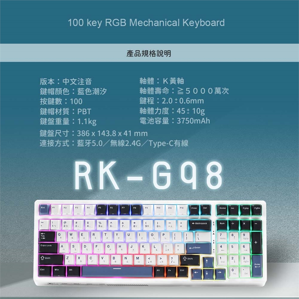 RK G98 藍色潮汐,採用深藍、淺藍、純白三種顏色PBT鍵帽,營造出不同時間潮汐的樣貌。