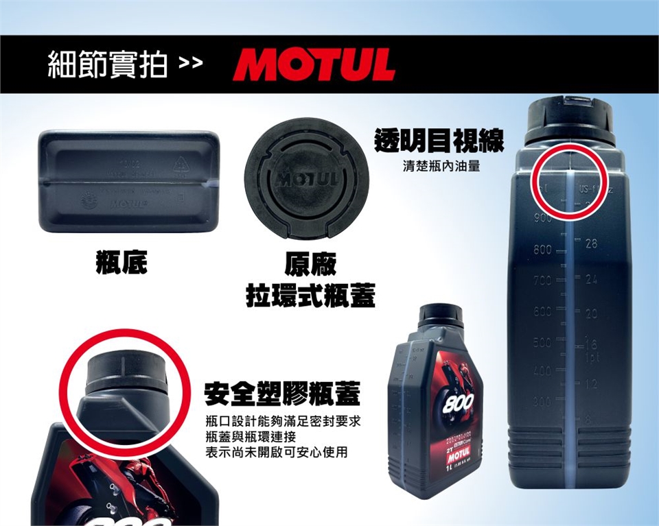 適合所有需使用預混機油的二行程競賽引擎,尤其是高速運轉及高負荷狀態下。適用於路賽及其他賽車運動,但若是油路注油系統,建議使用 Motul 710 2T 機油。
