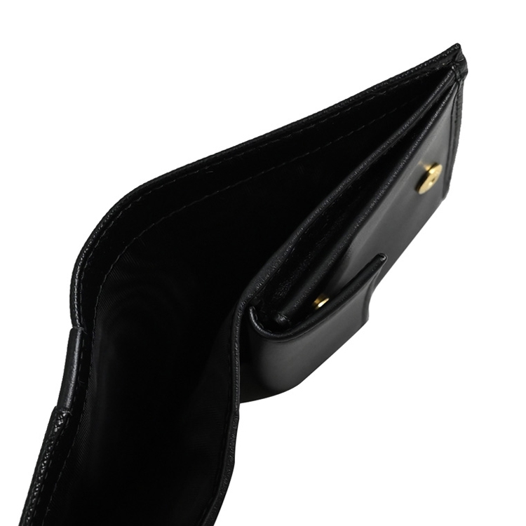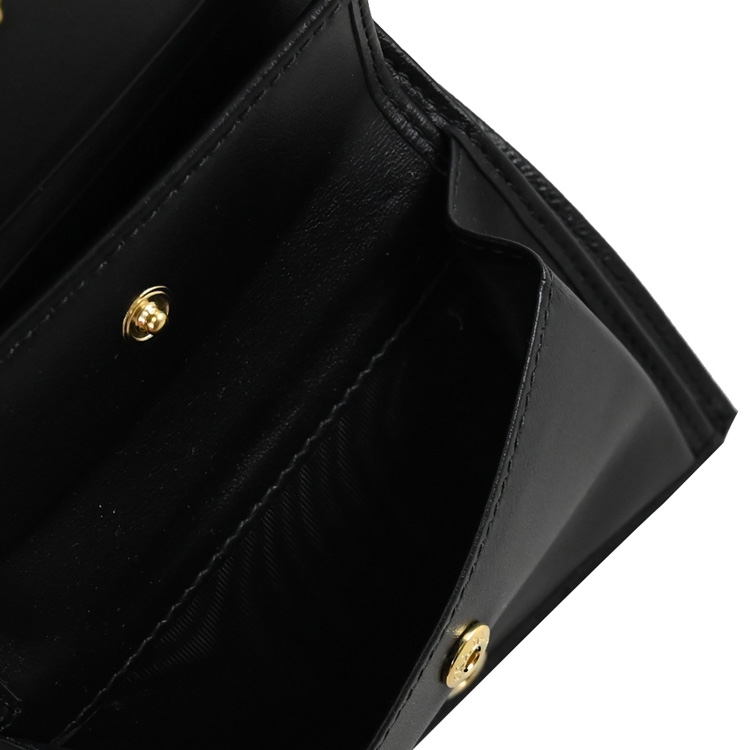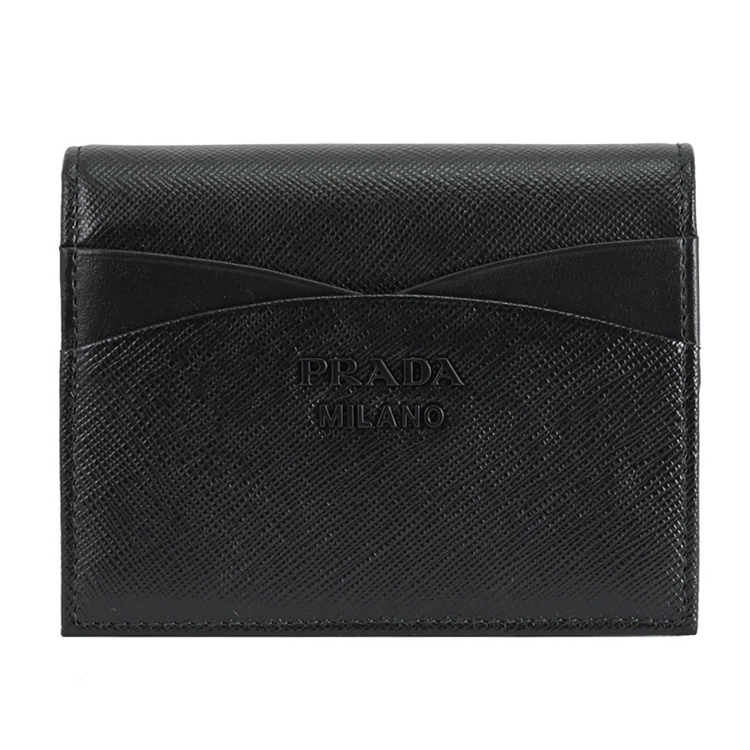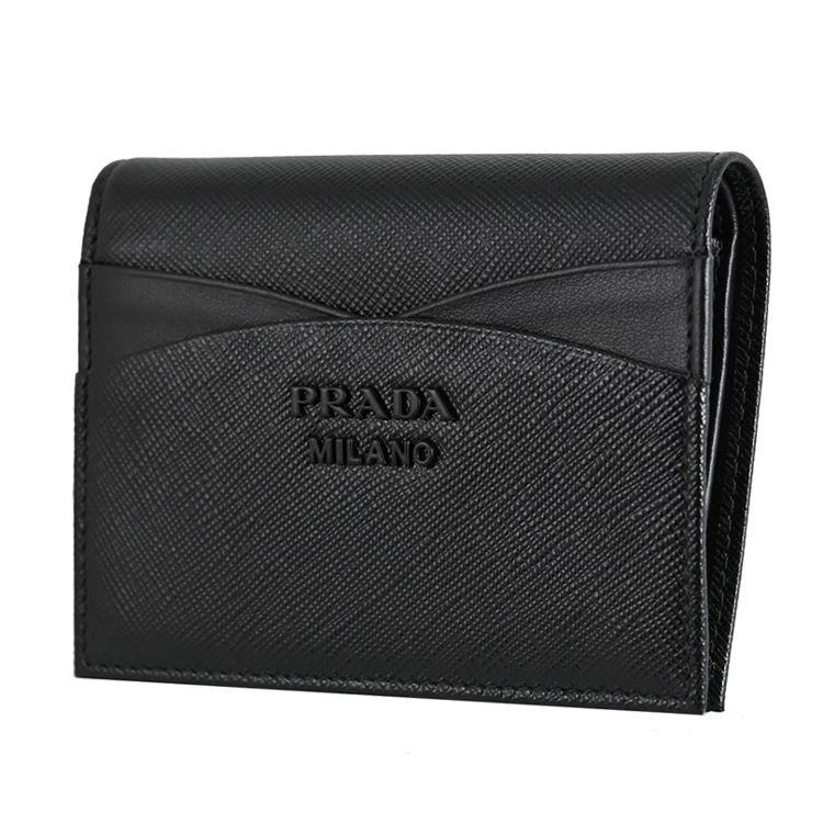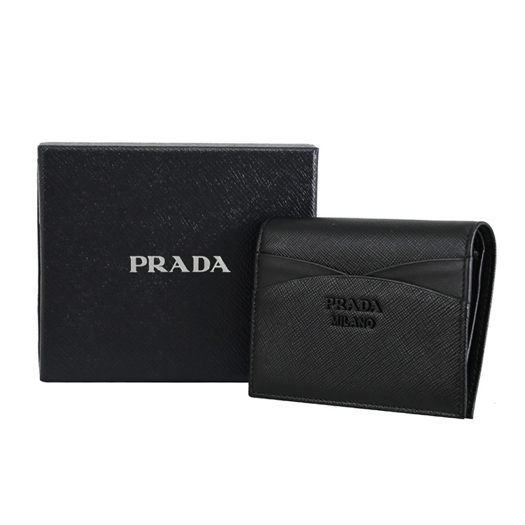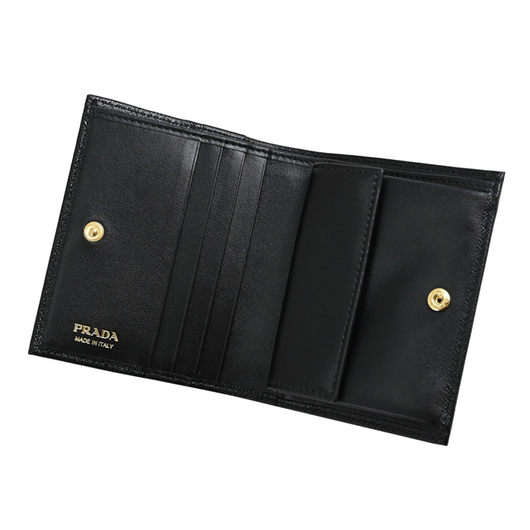 PRADA 專櫃熱銷扣式短夾,經典金屬LOGO加上十字紋防刮皮革拼接造型/內襯皮革,呈現不凡優雅時尚氣質,扣式開口/內有1鈔票夾+3信用卡夾+2內袋+1扣式零錢袋等可收納,簡約時尚有型,可放小包好收納,精品配件讓時尚氛圍隨處可見。
