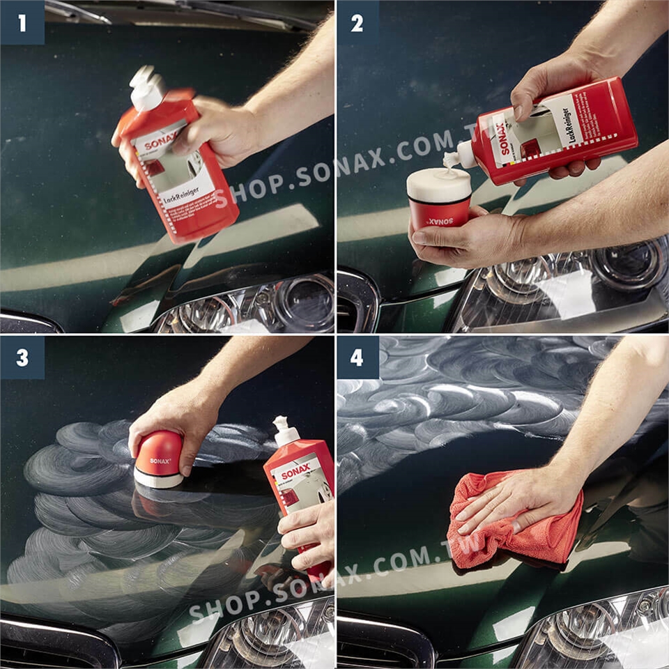 用上蠟海綿取少許的煥新清潔蠟後,均勻地塗抹於烤漆面。