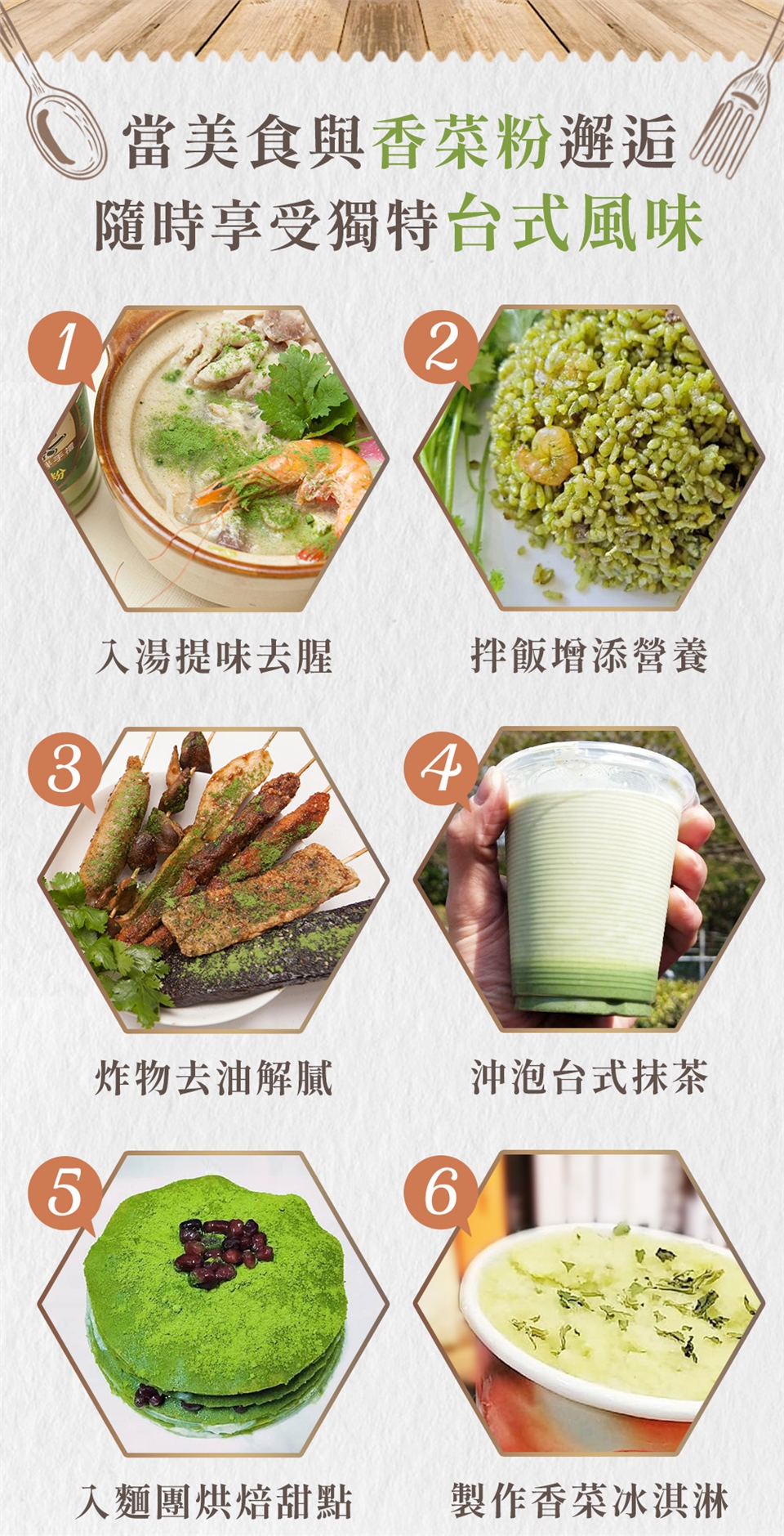 1. 沖泡:可直接沖泡開水喝,亦可加入咖啡、茶類、牛奶、豆漿、果汁、各式五穀...等飲品中。