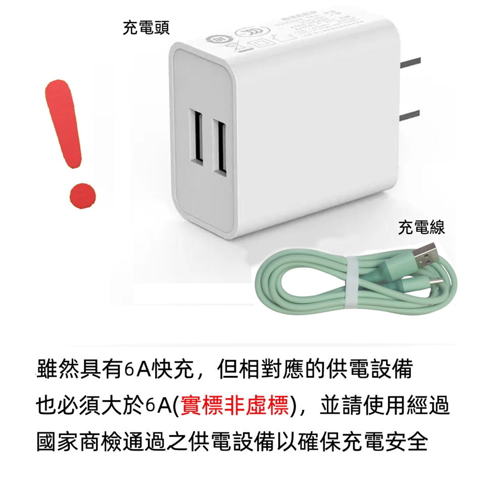1.本線雖然具有6A快充,但相對應的供電設備及充電線也必須大於6A(實標非虛標),並請使用BSMI通過之供電設備以確保充電安全。