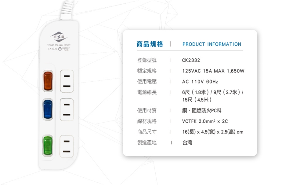 額定容量:125VAC 15A MAX 1,650W