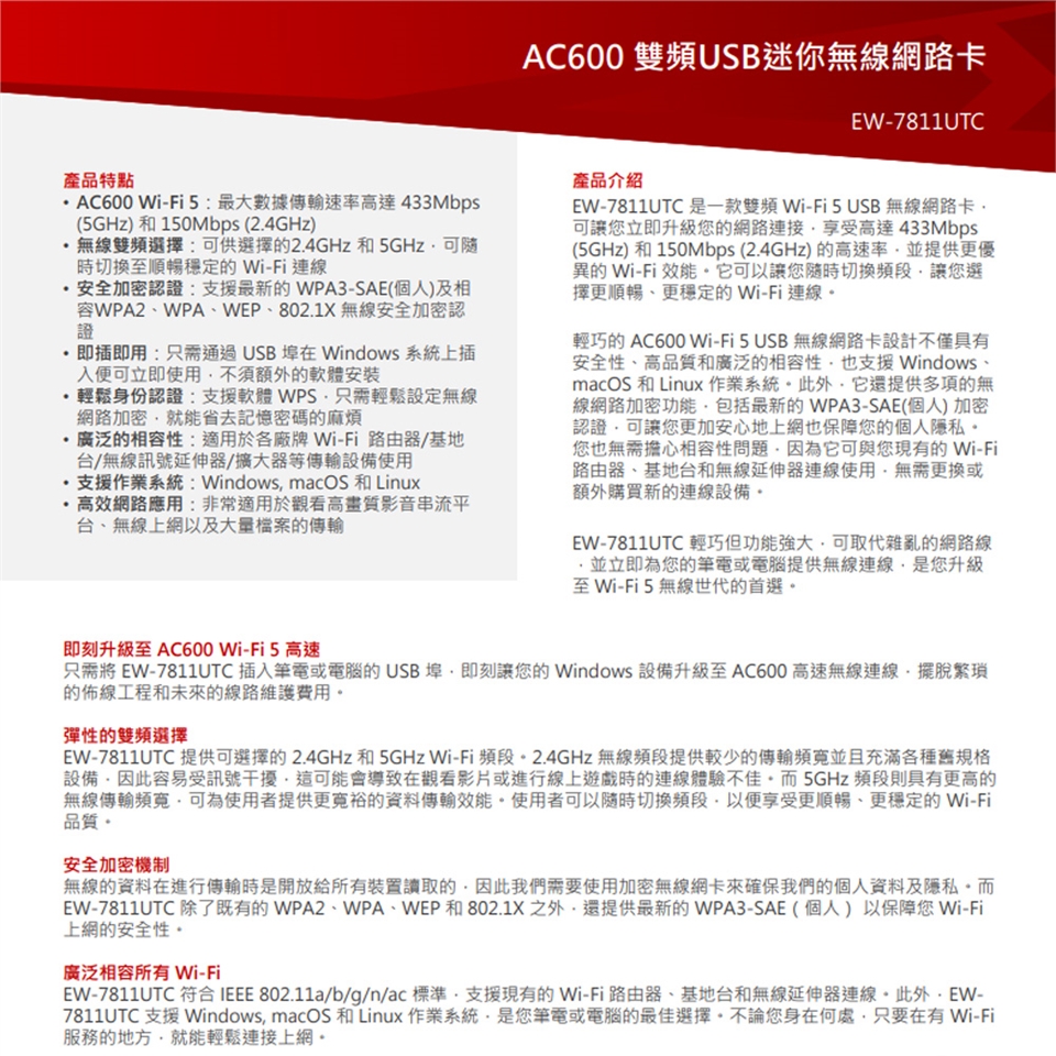 • AC600 Wi-Fi 5:最大數據傳輸速率高達 433Mbps