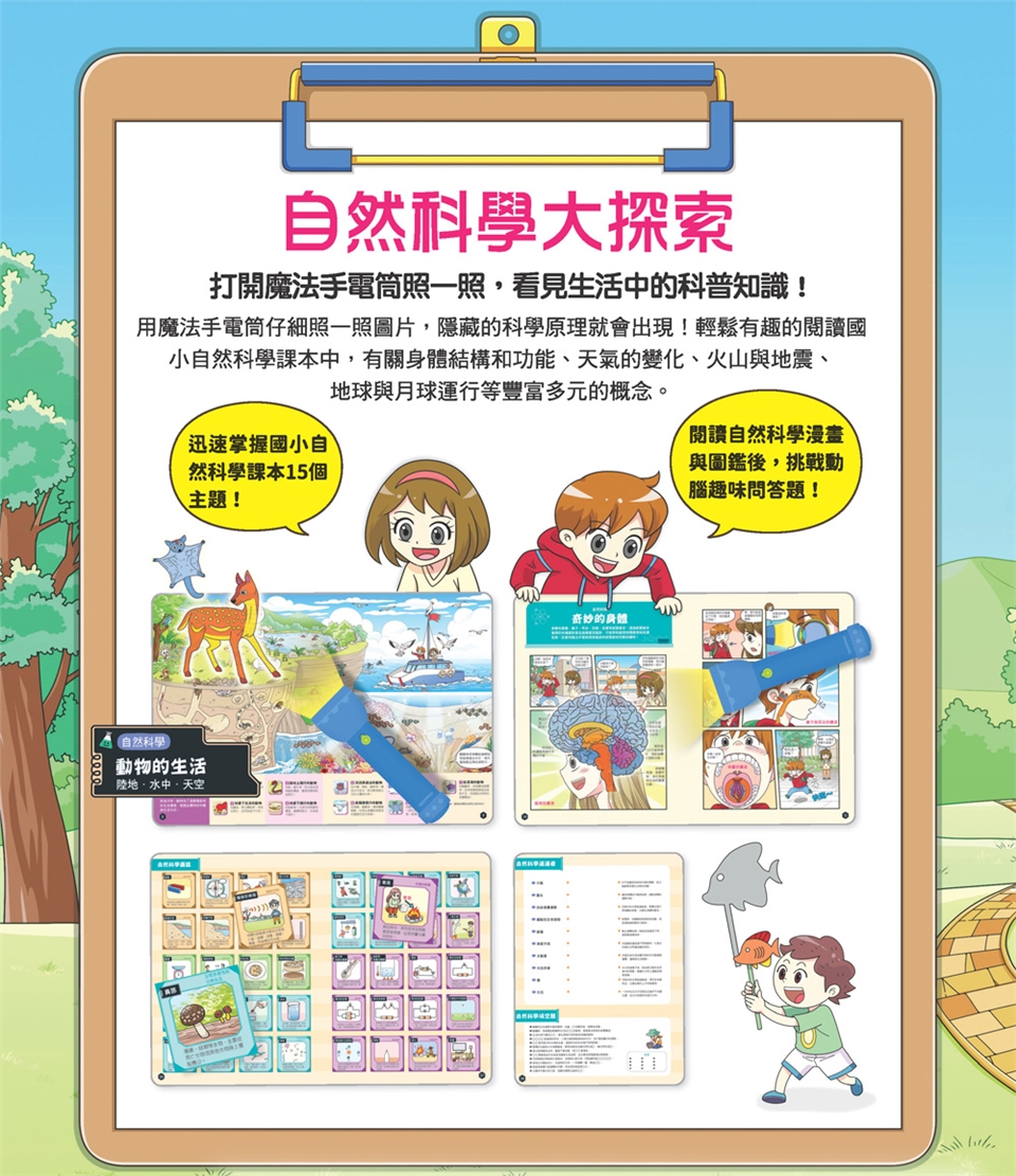 用魔法手電筒仔細照一照圖片,隱藏的科學原理就會出現!輕鬆有趣的閱讀國小自然科學課本中,有關身體結構和功能、天氣的變化、火山與地震、地球與月球運行等豐富多元的概念。