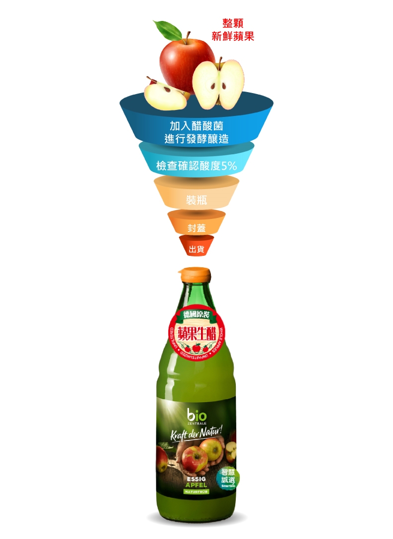 採以友善保護環境的耕作法,選用整顆蘋果,加入醋酸菌於溫控環境下發酵釀造製成蘋果醋。