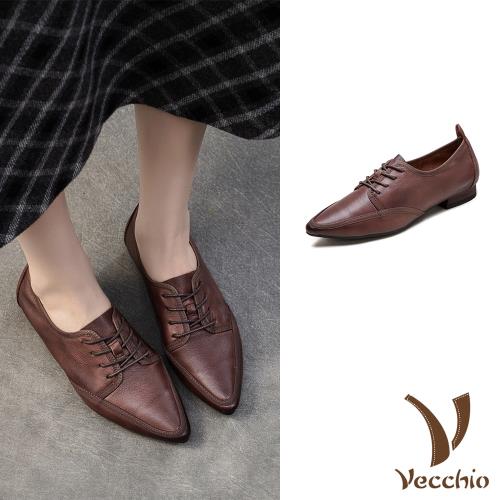 【VECCHIO】全真皮經典尖頭繫帶低跟鞋皮鞋/全真皮頭層牛皮復古經典尖頭繫帶低跟鞋 皮鞋 女鞋 咖