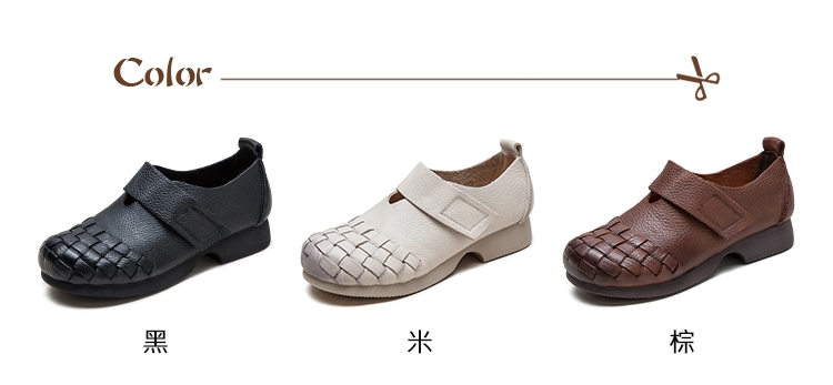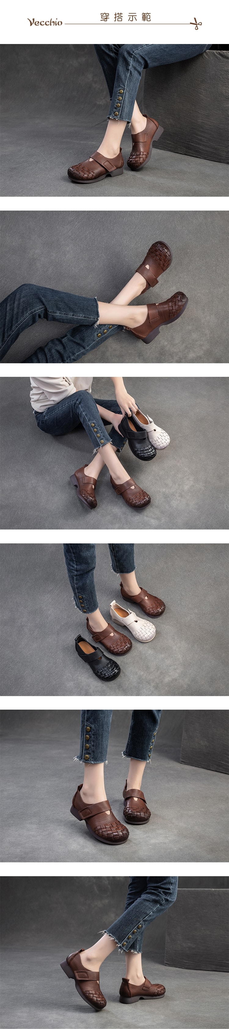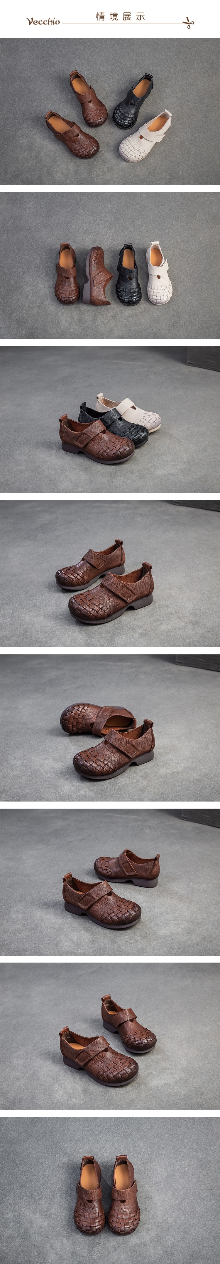 【VECCHIO】真皮編織拼接魔鬼粘粗跟休閒鞋/真皮頭層牛皮編織拼接魔鬼粘一字帶粗跟休閒鞋 女鞋 棕