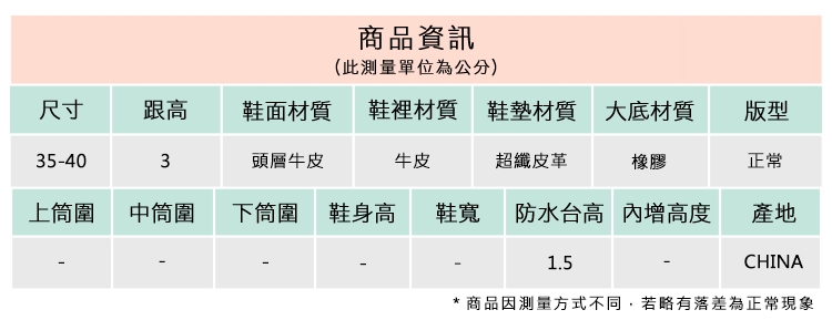 2.鞋類商品依功能及用途之不同,鞋底各有其止滑係數之個別不同,使用鞋類商品請用於正常平坦之路面,非雨鞋或雨靴類商品,請避免穿著於下雨濕滑路面上行走。