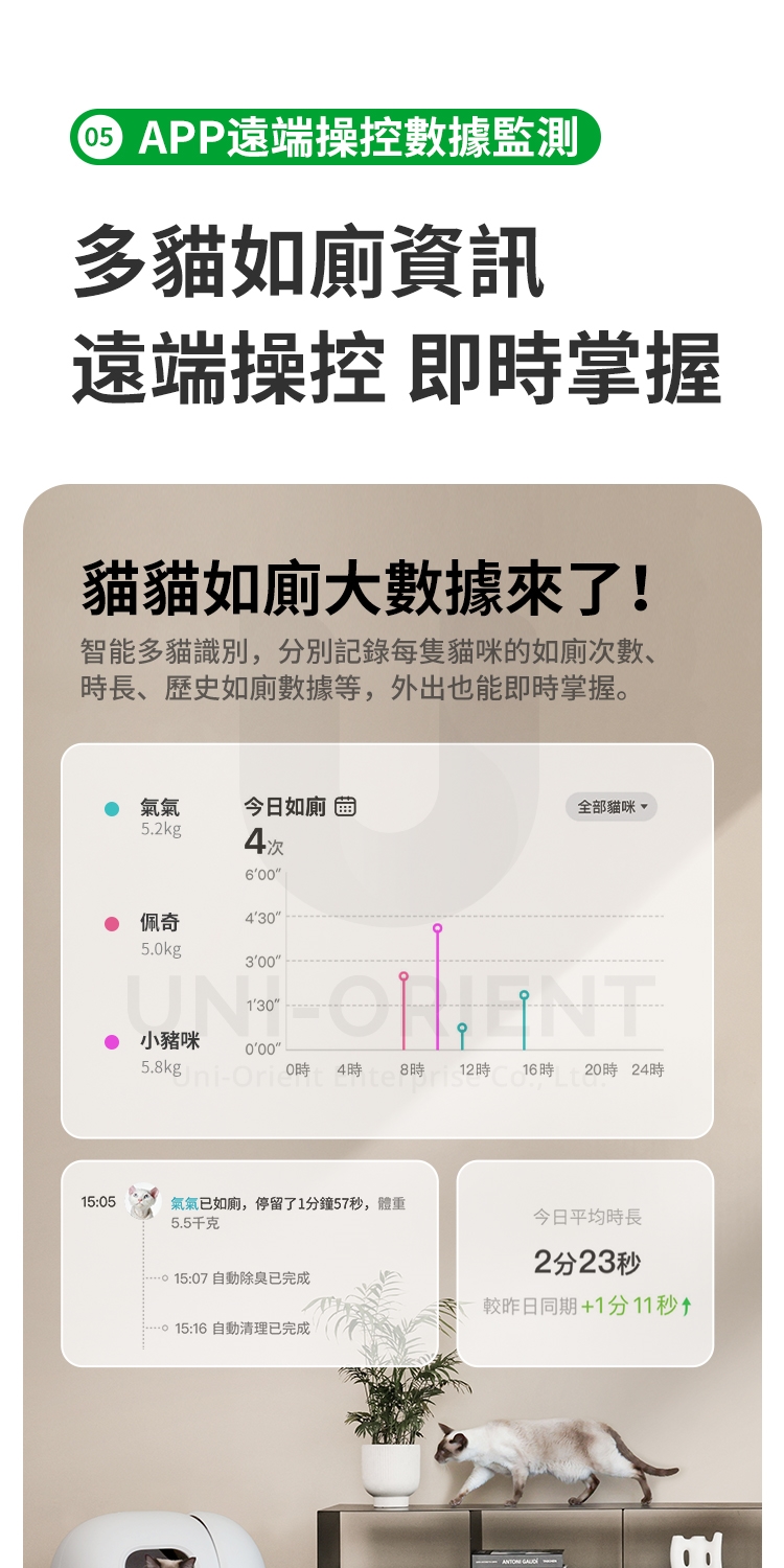 貓咪如廁大數據APP智能多貓識別,分別記錄每隻貓咪的如廁次數、時長、歷史如廁數據等,