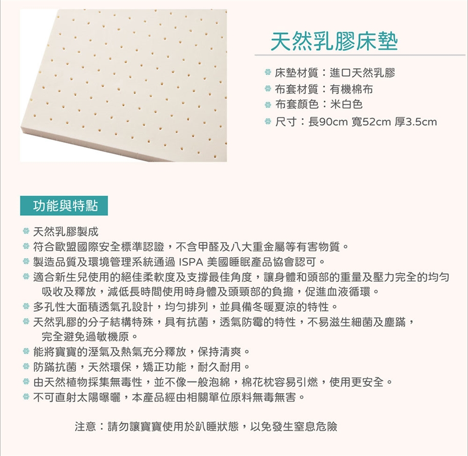 3:寶寶使用床墊建議仰睡,請勿讓寶寶直接趴睡於上,並隨時注意溢(嗆)奶、流口水情形,以免發生危險。
