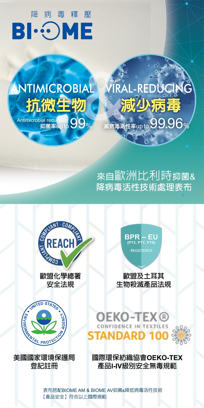 ◆ BIOME® Hygiene 衛生安全防護科技是歐洲比利時 Devan 公司於 2020 年最新發表的結合減少病毒活性和抗菌技術,