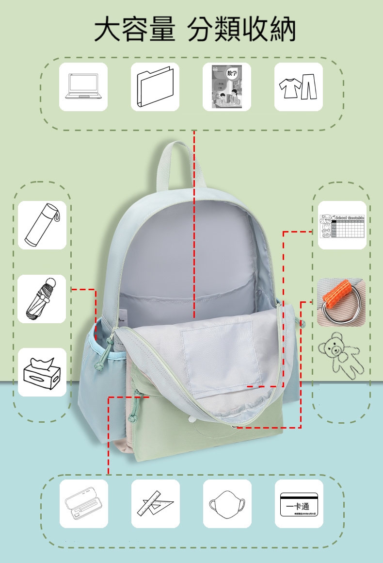 內層分隔收納,背包兩側口袋可以放水壺跟雨傘