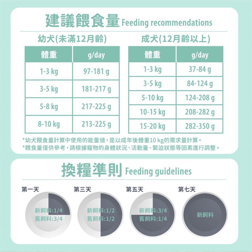 • 脂肪:狗狗需要脂肪提供能量和維持健康皮膚。建議幼犬脂肪含量應在約17%,成犬應在9-15%之間。