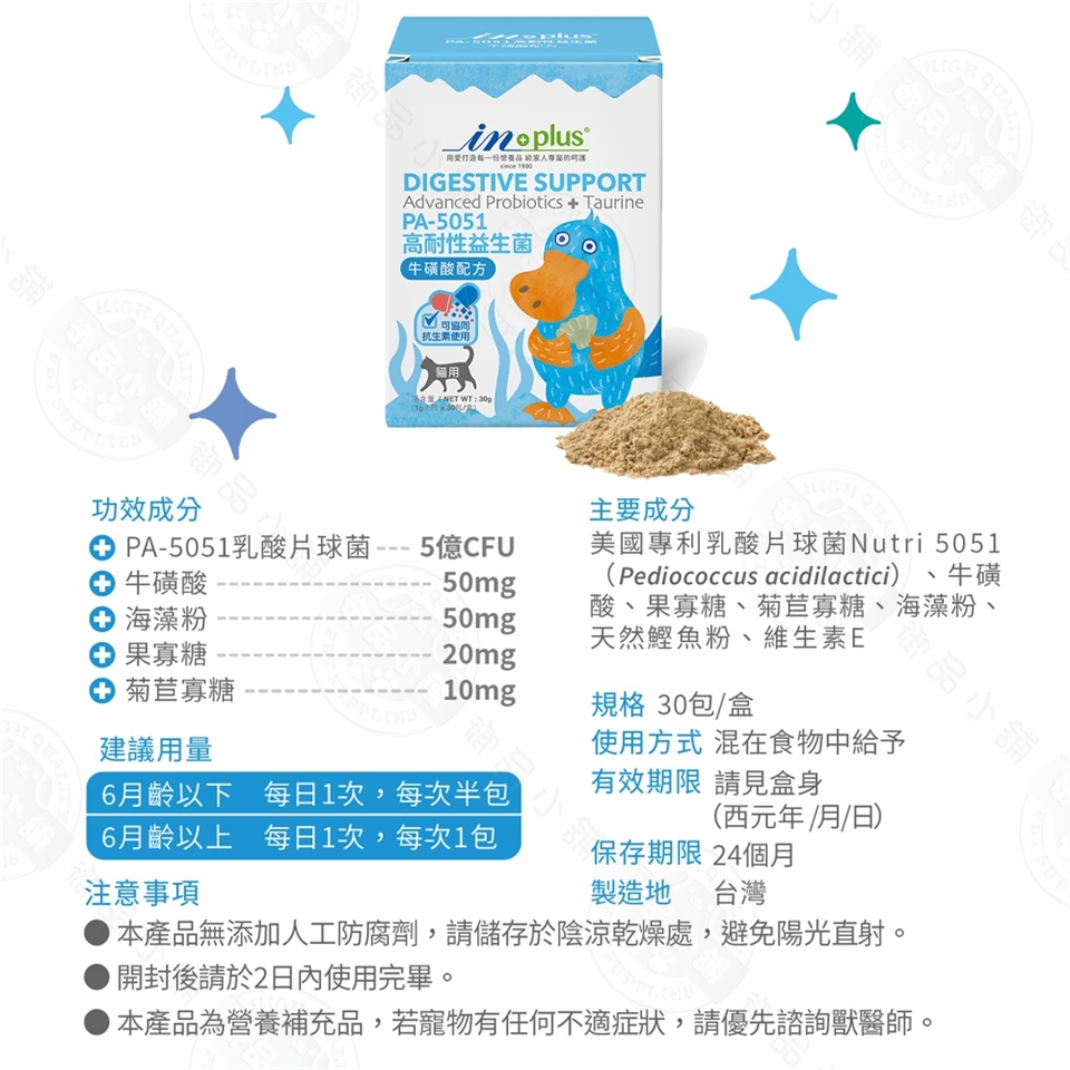 IN-Plus 腸胃保健 PA-5051貓用高耐性益生菌 牛磺酸配方(1克x30包)貓保健品 腸胃消化 加強保健 耐高溫