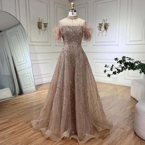 【女神婚紗禮服】優雅羽毛飛飛短袖釘珠立領A字宴會晚禮服LA72351焦糖棕