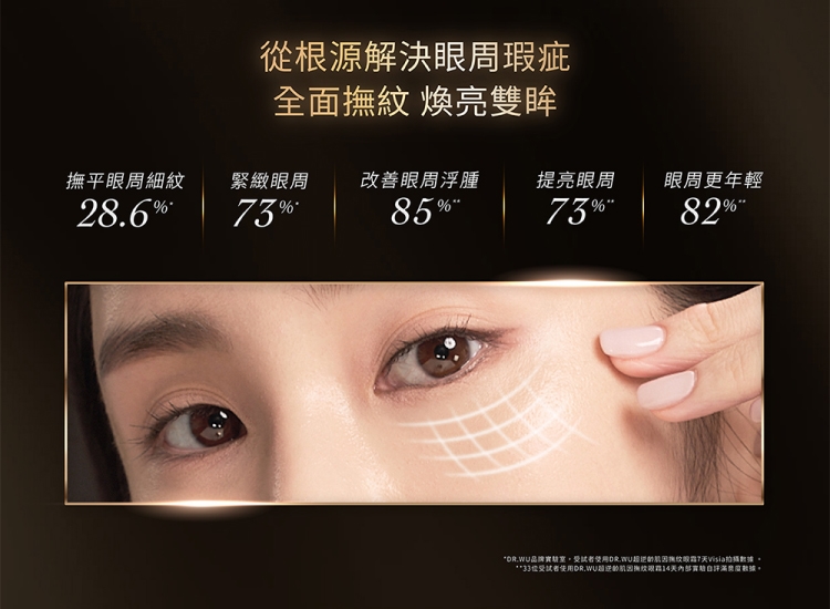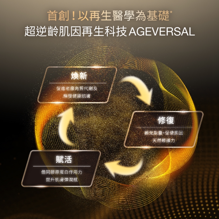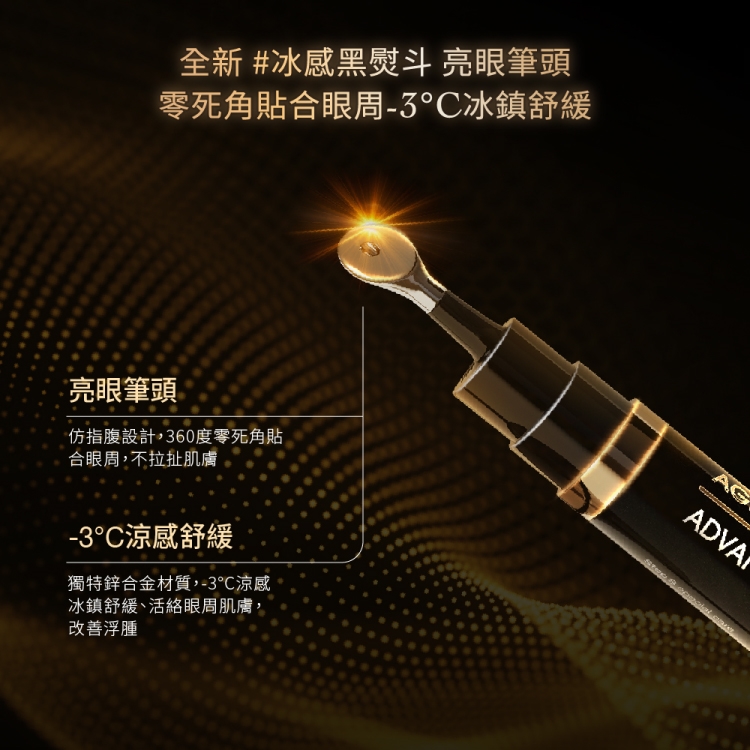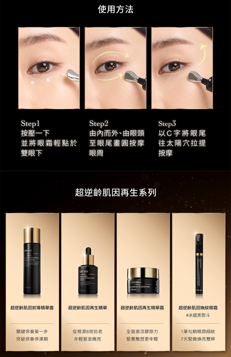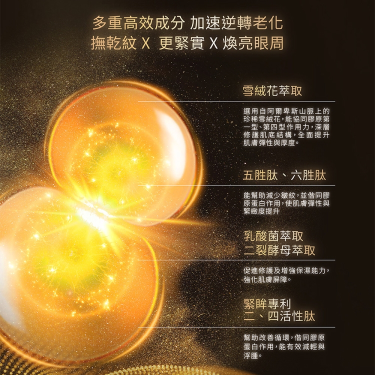 業界獨家「超逆齡肌因再生科技 AGEVERSAL」,結合再生醫學理論,以「煥新、修復、賦活」三大機制,從根源解決老化狀況,代謝老廢肌因,並提升肌因自我再生力及修護力,全面啟動肌因再生,賦活肌膚年輕狀態。緊眸專利二、四胜肽,搭配五、六雙重胜肽,促進眼周循環!搭配取自阿爾卑斯山脈嚴峻氣候生長雪絨花精萃,具強效抗氧化力,協同膠原蛋白第一型、第四型作用力,深層修護肌底結構,點線面提升肌膚彈性與厚度!搭配冰感亮眼筆頭,圓弧曲線設計,完美貼合眼周輪廓,打造電力滿點的雙眸!