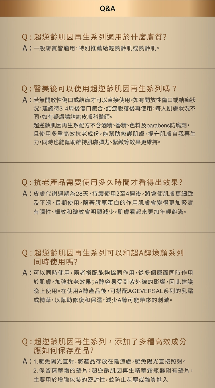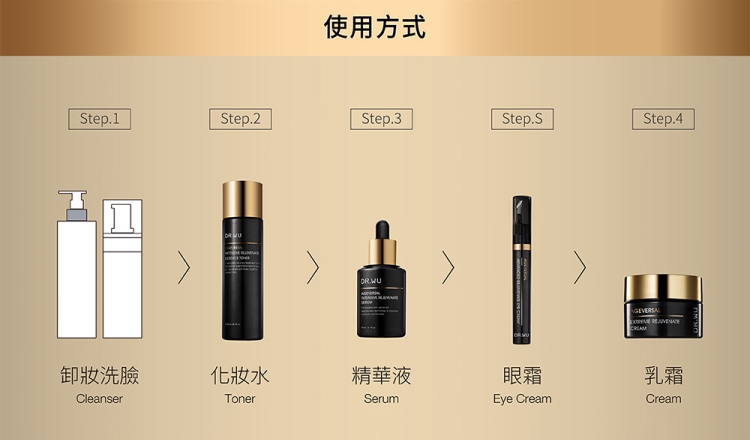 卸妝、清潔→超逆齡肌因前導精華露→超逆齡肌因再生精華→超逆齡肌因再生精華霜→超逆齡肌因撫紋眼霜→防曬隔離