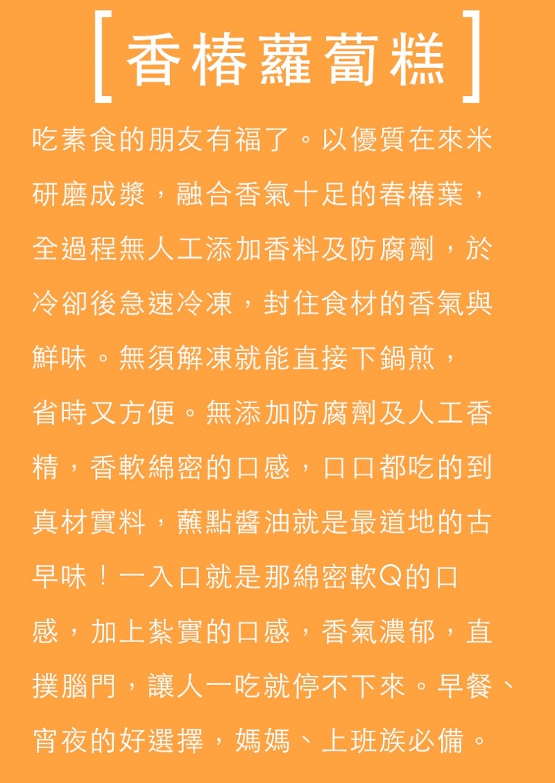 無須解凍就能直接下鍋煎,省時又方便。無添加防腐劑及人工香精,香軟綿密的口感,口口都吃的到蘿蔔的真材實料,蘸點蒜頭醬油就是最道地的古早味!