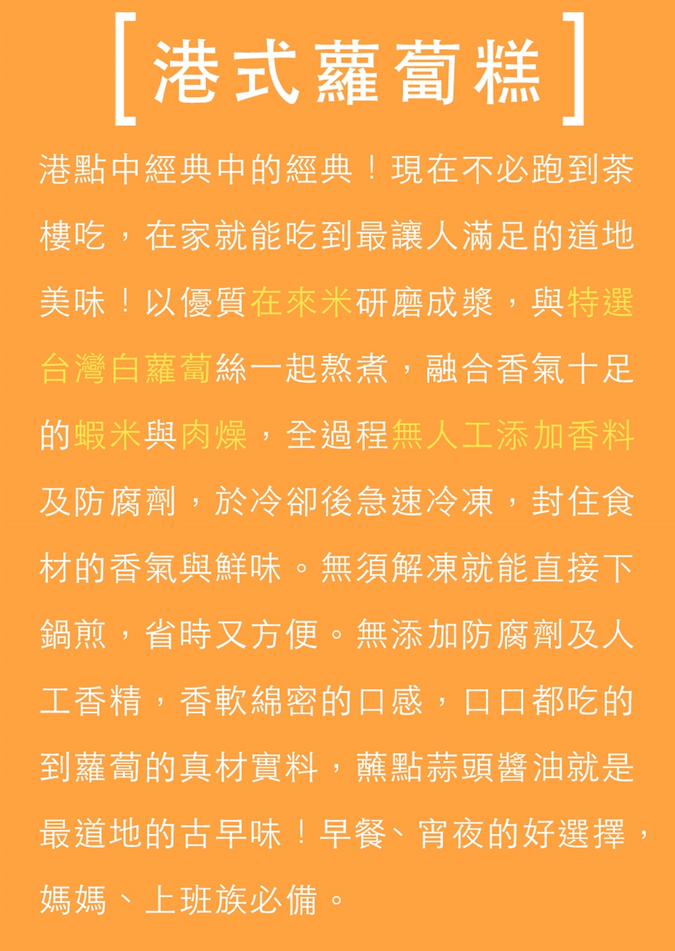 以優質在來米研磨成漿,與特選台灣白蘿蔔絲一起熬煮,融合香氣十足的蝦米與肉燥,全過程無人工添加香料及防腐劑,於冷卻後急速冷凍,封住食材的香氣與鮮味。