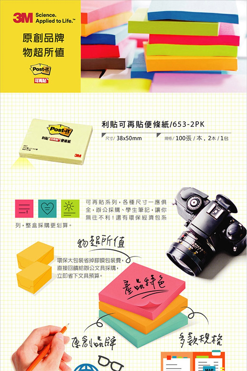 ●可重複黏貼、表面可書寫、撕下不傷文件