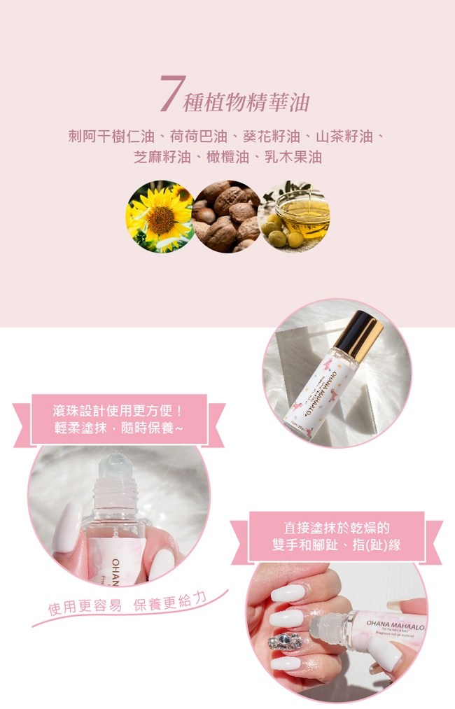 香精油--可直接塗抹於乾燥的雙手和腳趾、指(趾)緣,輕柔按摩至吸收。也可用於外出、旅行時的頭髮造型保養或作為精油香水。