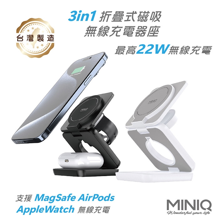 MINIQ 3in1 22W 折疊式磁吸無線充電器座(手機/手錶/耳機)