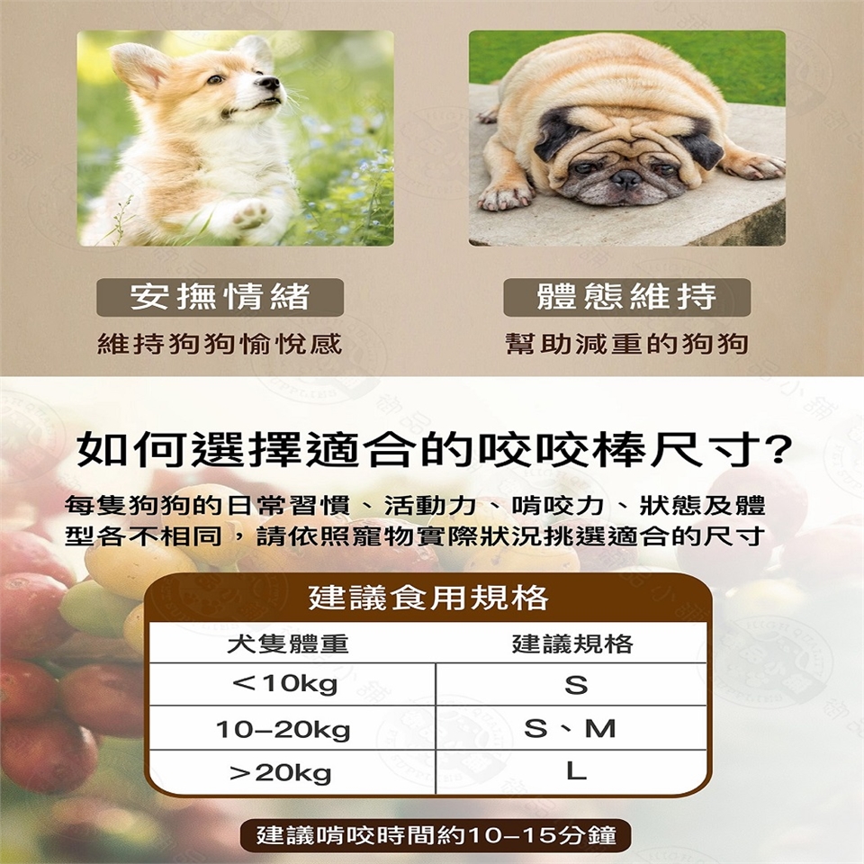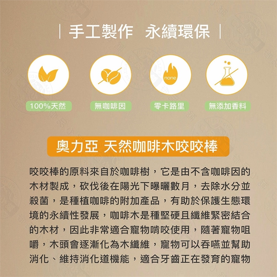 ●注意事項:當寵物在啃咬咖啡木時可能會使細小的 木纖維剝落,這些天然的木纖維是無害 的,會被消化排出體外,啃咬時請飼主 在旁監看,建議啃咬時間10-15分鐘