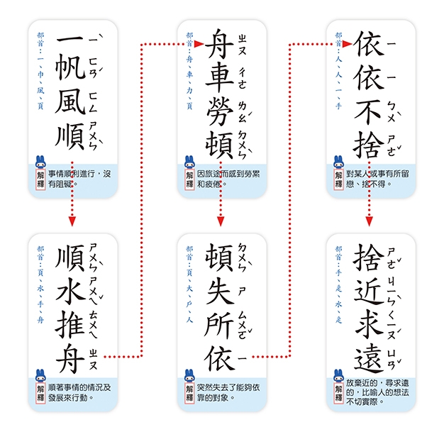 將成語卡攤放在桌上或地上,先找出「一帆風順」當開頭後,試著完成一百句成語接龍。