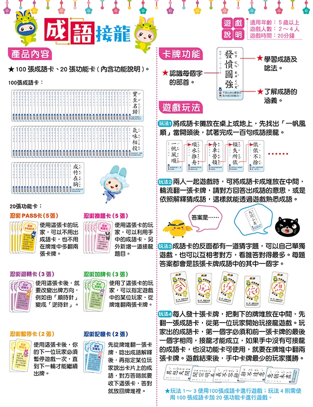 內容物:100成語卡+20張遊戲功能卡+1張遊戲說明書