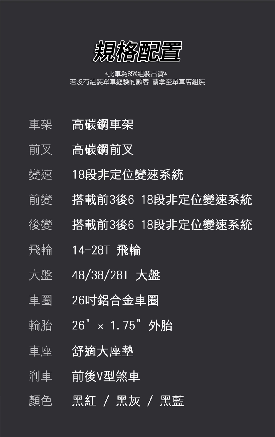 ● 此台車為85%組裝出貨,請將車拿至單車店交由專業人員組裝!