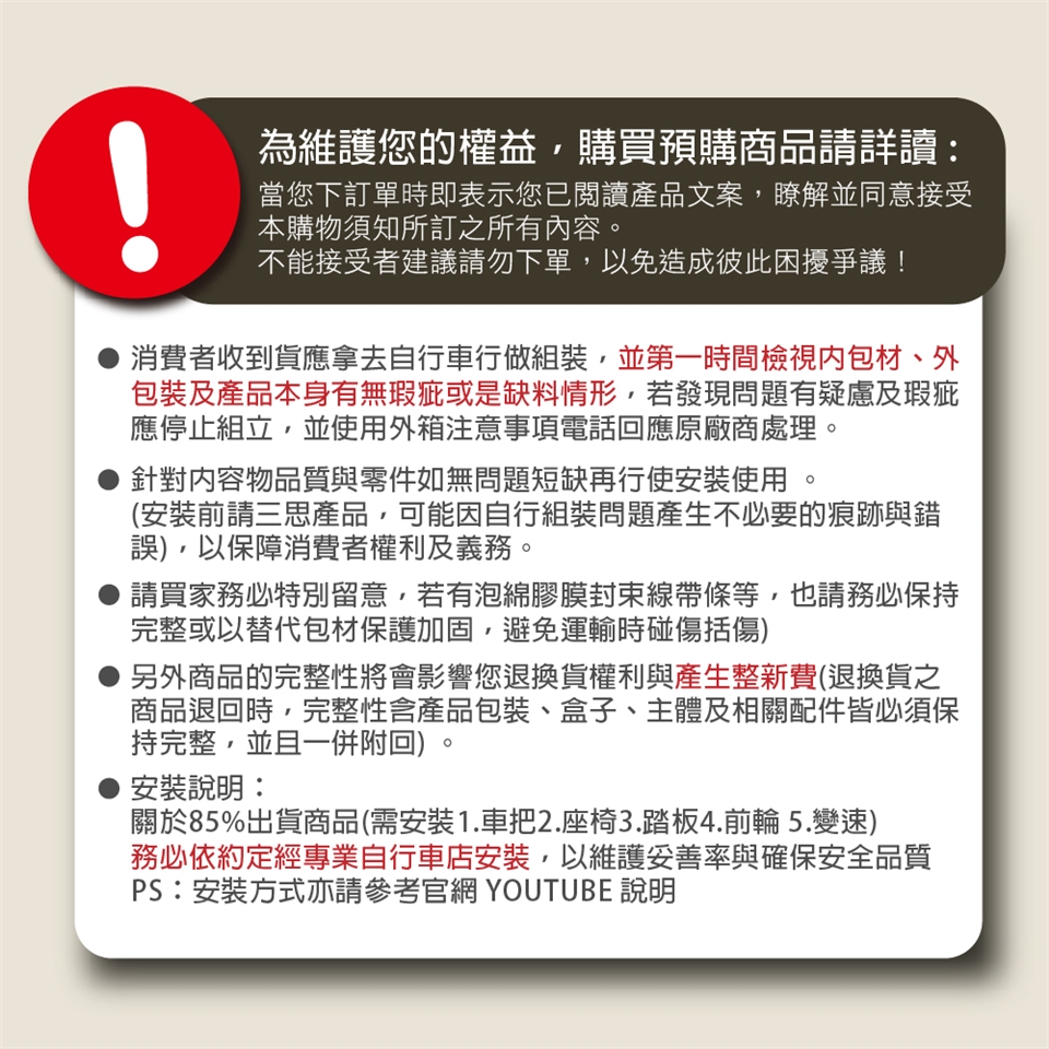 ● 消費者收到貨應拿去自行車行做組裝,並第一時間檢視內包材、外包裝及產品本身有無瑕疵或是缺料情形,若發現問題有疑慮及瑕疵,應停止組立回應原廠商,以保障消費者權利及義務。