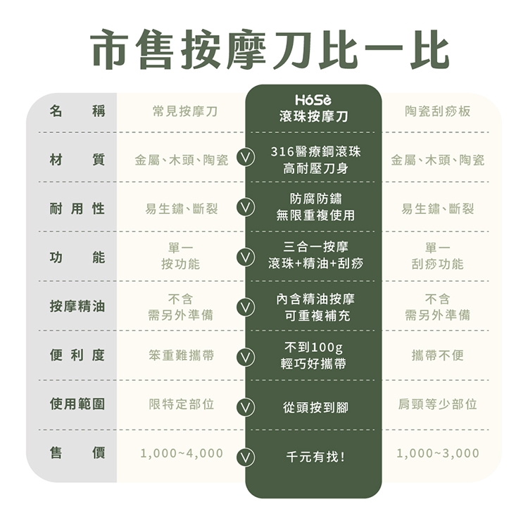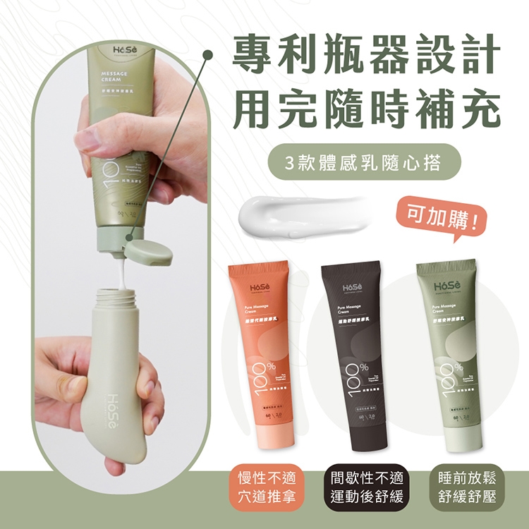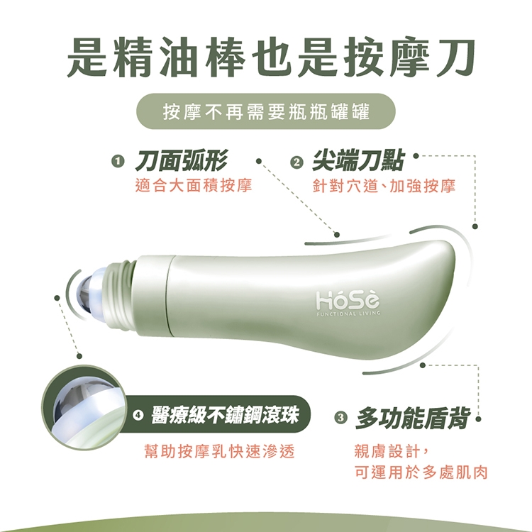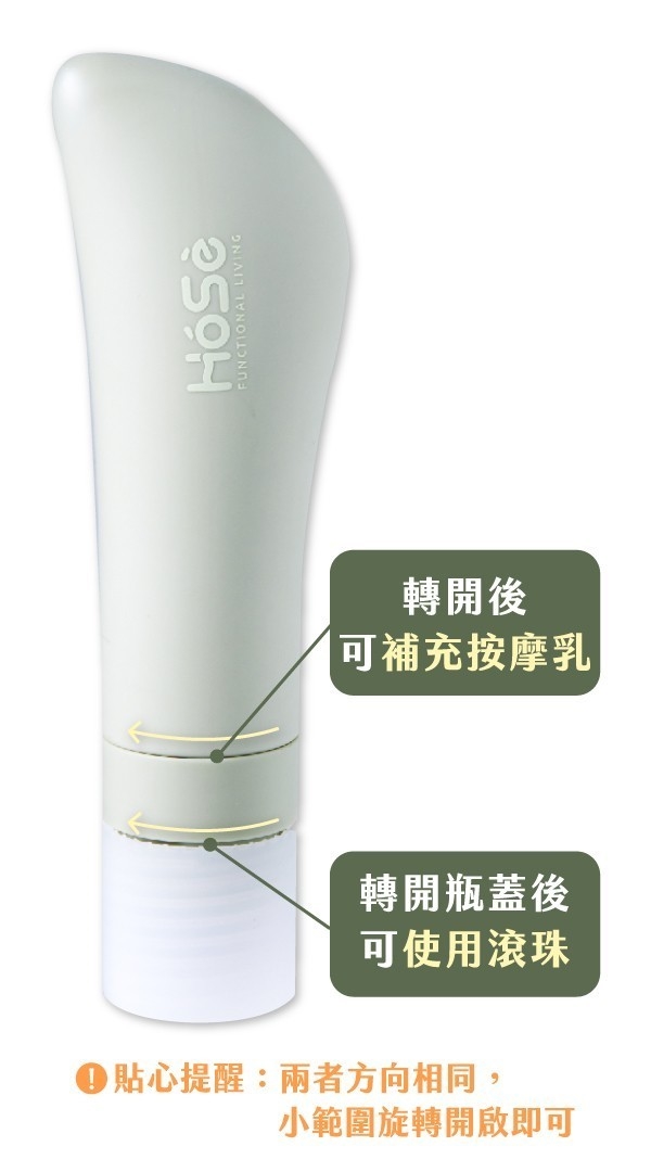 HOSE團隊歷時三年首創三合一的設計,將滾珠、按摩膏容器、刮痧刀完美結合成便利的按摩工具。產品除了獲得多名醫師、物理治療師、藥師的推薦外,更通過德國權威皮膚科醫生協會的Dermatest認證,敏感肌也適合。