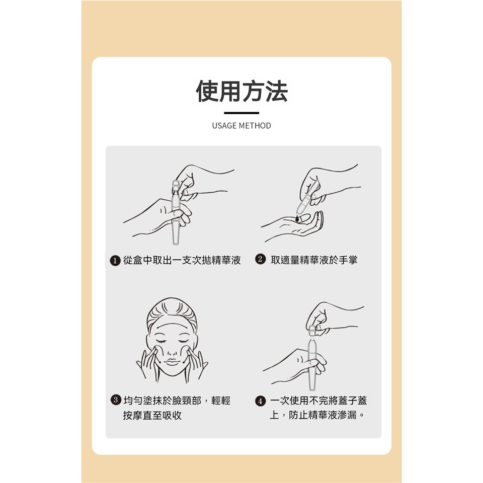 每日早晚水妝水後使用,取一支精華液,旋轉開啟擰斷頂帽,直接塗抹於面部肌膚,輕輕按摩至充分吸收。