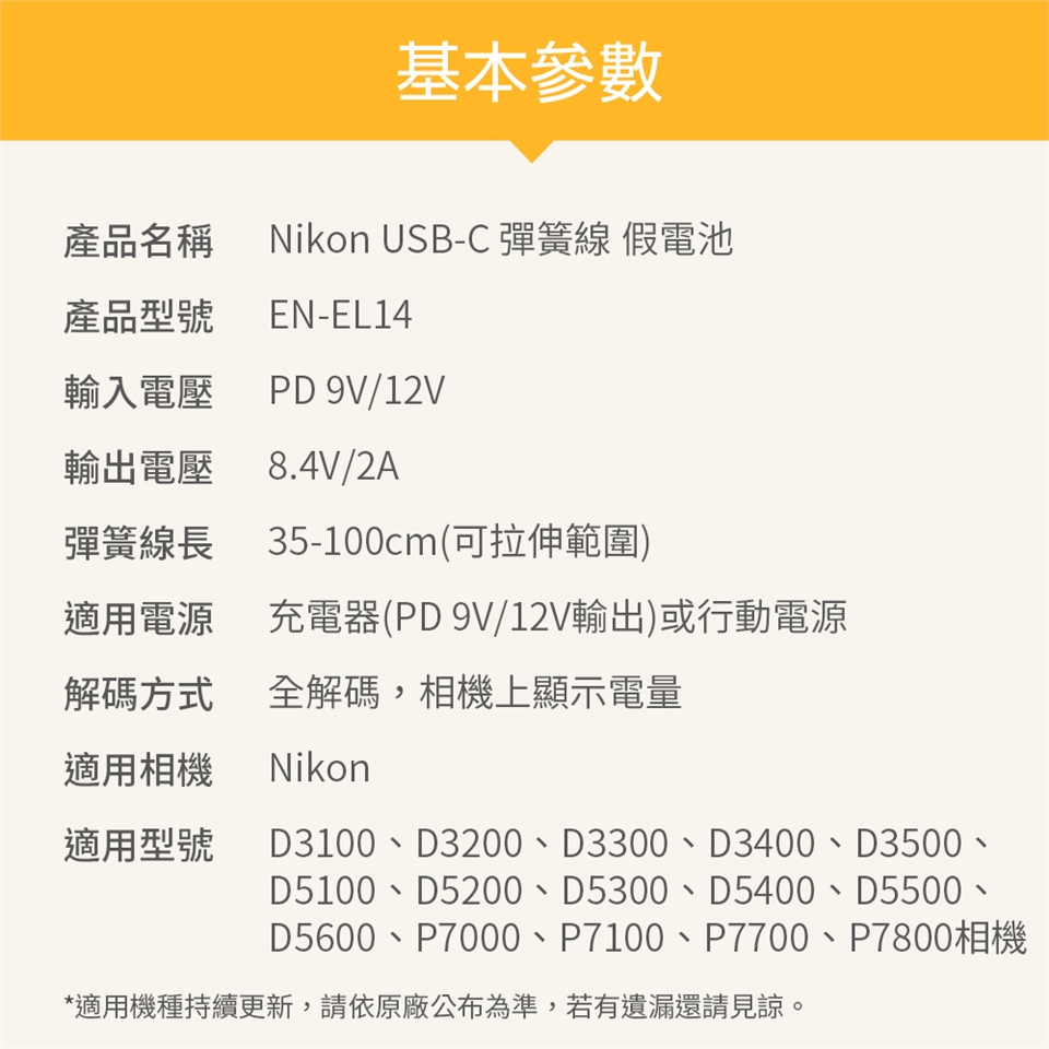 輸入電壓:PD 9V/12V 輸出電壓:8.4V/2A 彈簧線長:35-100cm(可拉伸範圍) 適用電源:充電器(PD 9V/12V輸出)或行動電源 解碼方式:全解碼,相機上顯示電量 適用相機:Nikon
