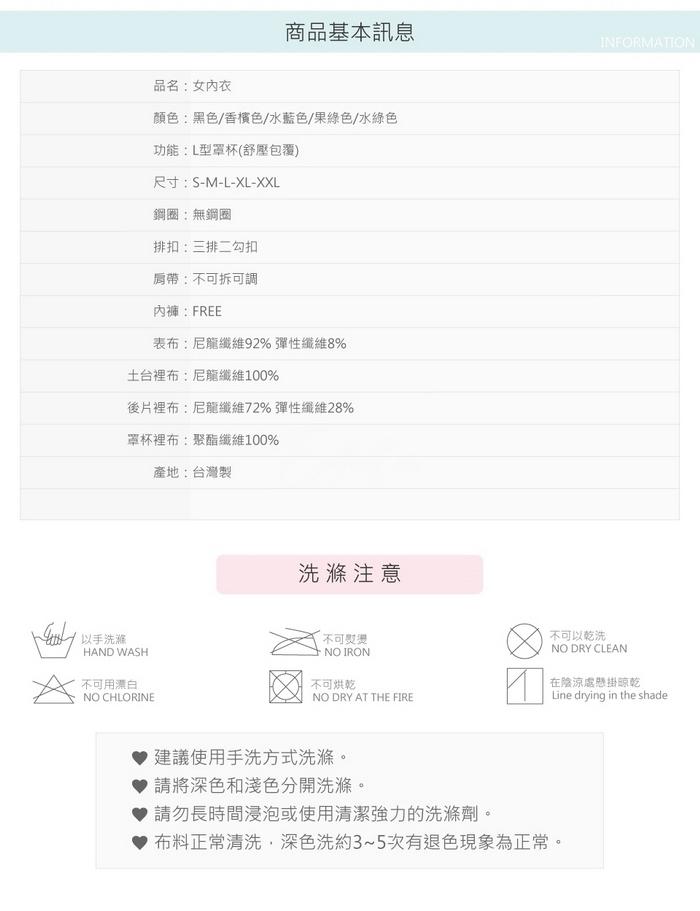 ♥貼心小叮嚀br/‧洗滌時建議使用中性洗潔劑手洗,不可長時間浸泡再洗滌。br/‧請勿放置洗衣機中攪拌及脫水,避免洗衣機破壞物品的纖維。br/‧洗滌前請先將拉鍊、扣鉤鉤上,避免洗滌時損傷到衣物。br/‧請以冷水或40度C以下的溫水清洗。br/‧請用手指按洗或輕揉髒污部位,請勿扭絞衣物。br/‧清洗完畢,請先平整衣物,再放置於通風陰涼處晾乾。br/‧請避免陽光直接照射,以防止衣物彈性鬆弛或組織脆化。