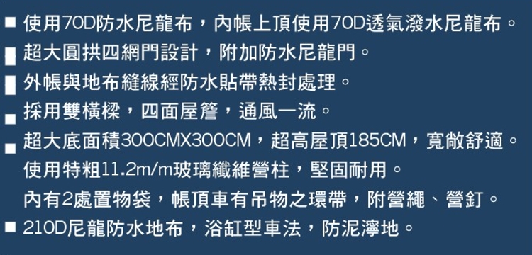 • 外帳及地布使用70D防水尼龍布,內帳使用70D透氣防潑水尼龍布。