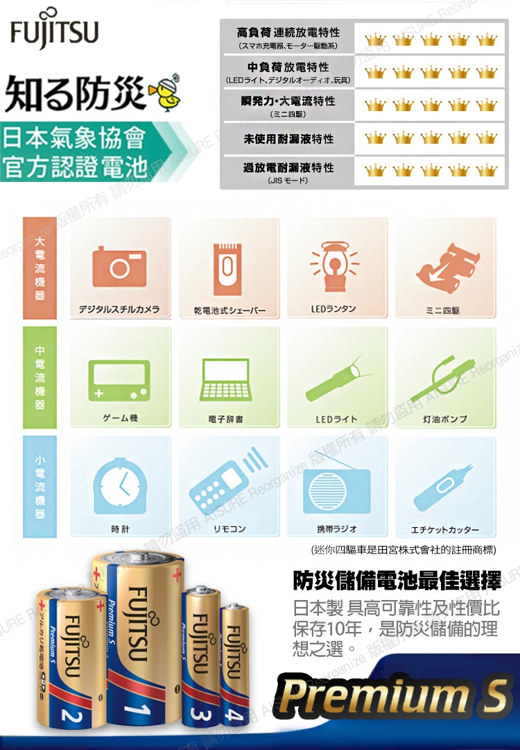 商品名稱 : 日本製FUJITSU富士通 Premium S(LR6PS-8S)超長效強電流鹼性電池-3號AA 精裝版48入裝
