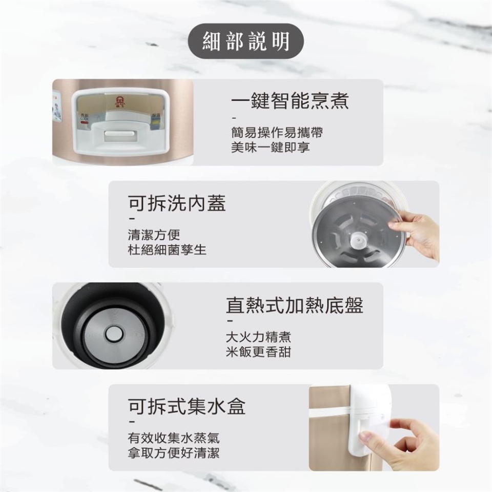 (1) 可拆式內蓋,直熱式炊飯設計,使米飯更加香Q。