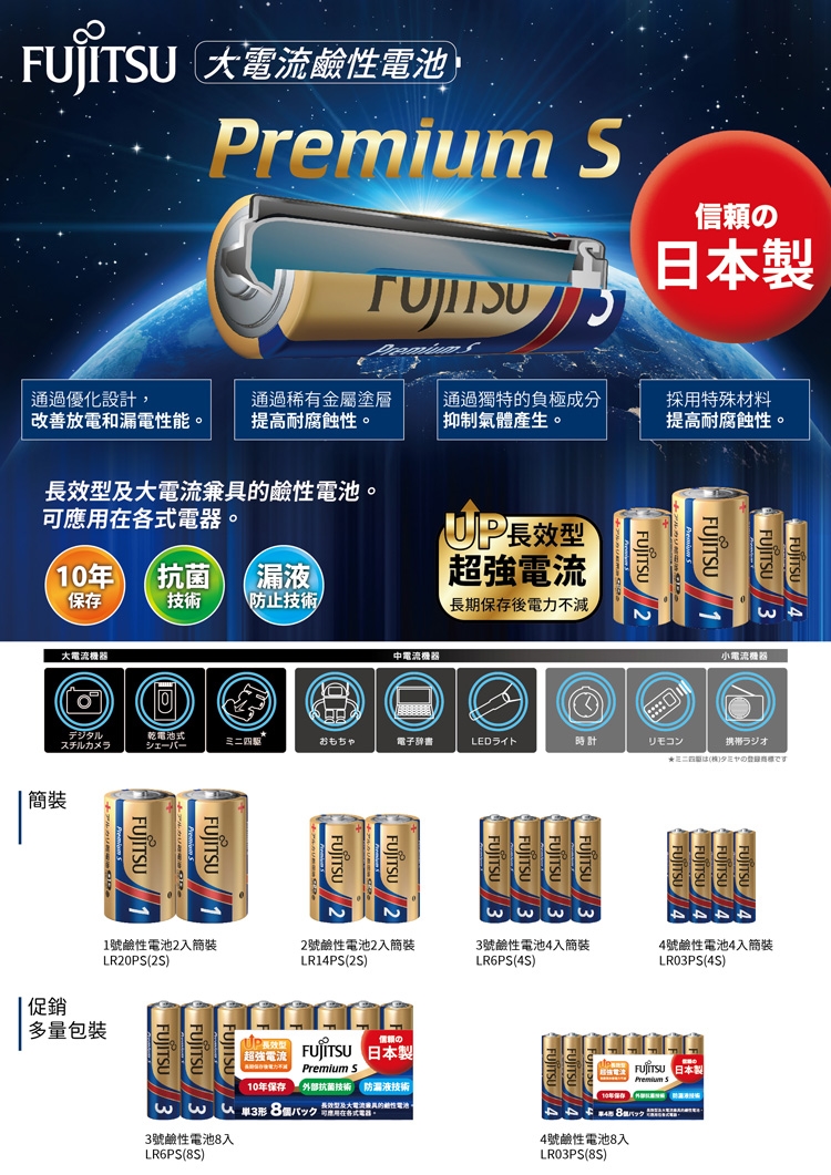 日本製FUJITSU富士通 Premium S(LR14PS-2S)超長效強電流鹼性電池-2號C 精裝版12入裝