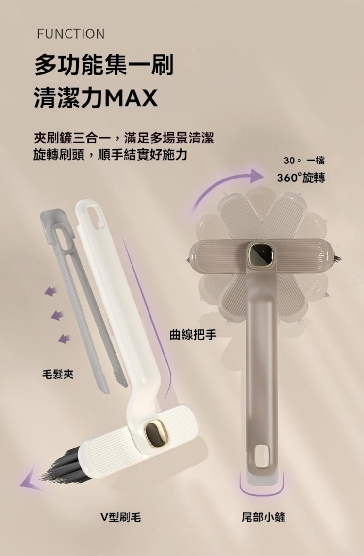硬毛刷頭具備超強清潔力,360度旋轉設計深入每個角落和縫隙,無死角清潔。