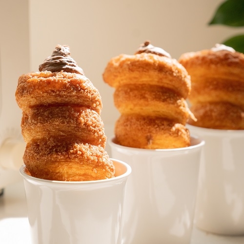 酥脆丹麥餅皮捲成圓筒,內餡灌滿苦甜巧克力,搭配酥脆巧克力脆片,撒上肉桂糖,香濃不膩!