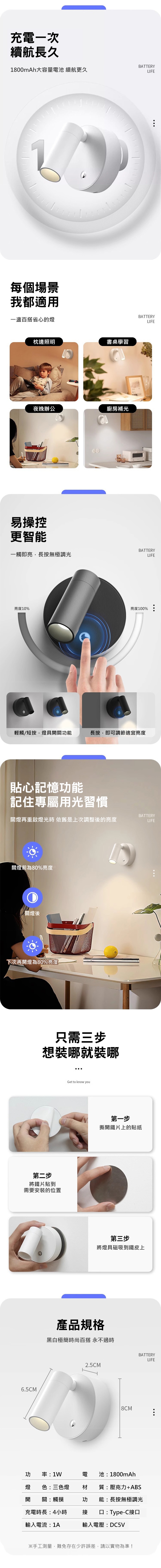 亮度調節:長按可調整亮度,滿足不同光線需求